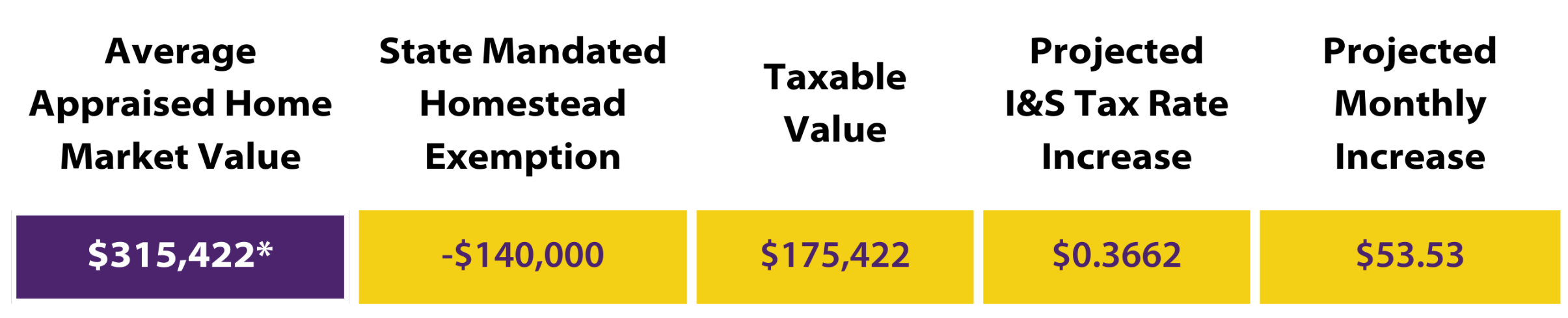 The projected tax impact is $0.3662 per $100 of property value if the proposition passes. For the average home in La Grange ISD valued at $315,442, the projected tax impact would be $53.53 per month.