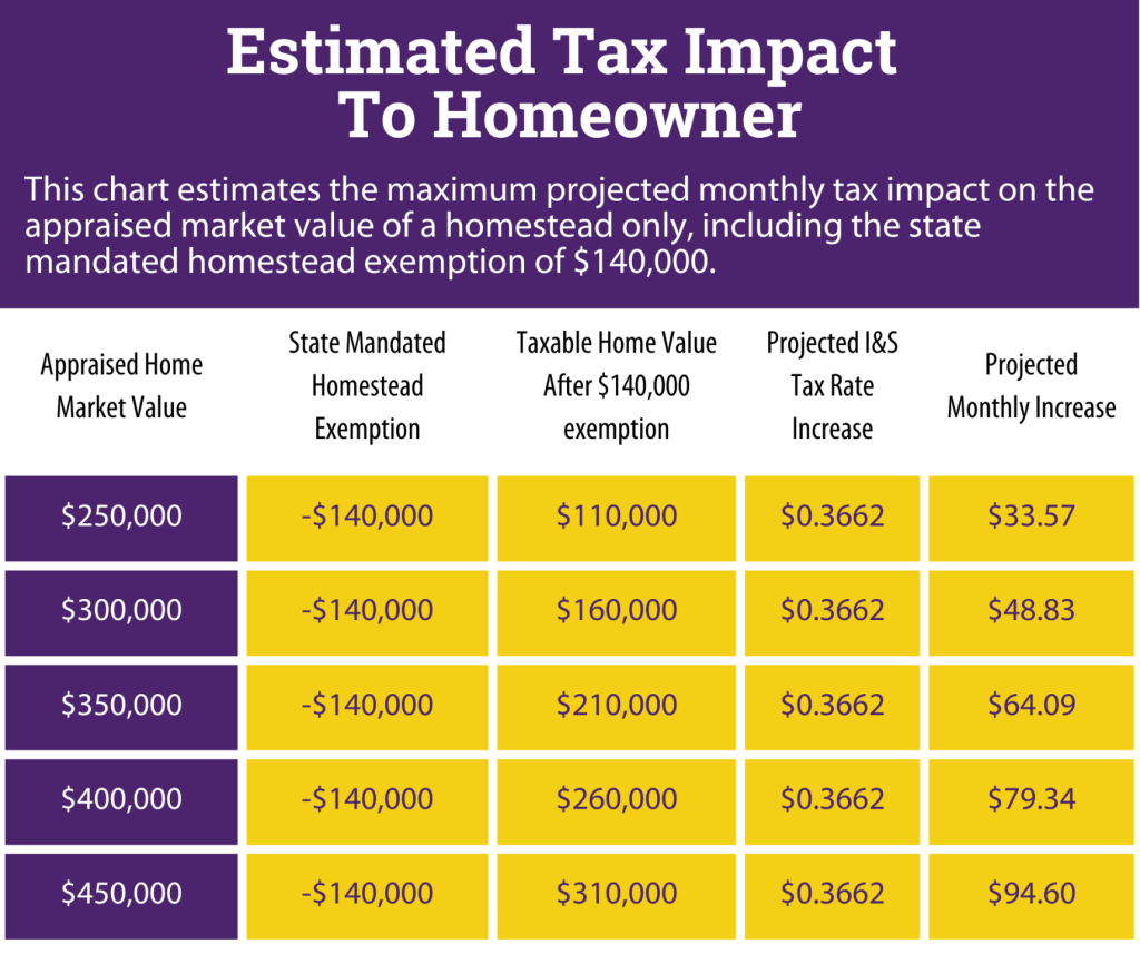 Homeowners age 65 and older or those disabled will not incur an increase of LGISD taxes above their current exemption ceiling as long as a homestead and over 65 or disabled exemption have been filed with the Fayette County Appraisal District. Texas law provides a school tax ceiling for homeowners who are 65 and older or disabled, meaning their school district tax bill will not increase above their ceiling as a result of this bond election, unless significant improvements are made to the homestead.